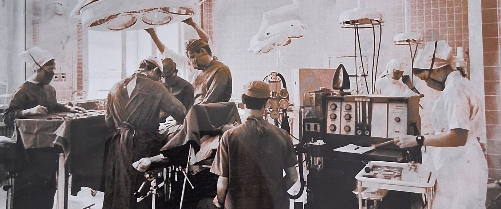 Im großen Saal stehen zwei OP Tische nur ungefähr zwei Meter fünfzig auseinander, heute undenkbar! Der Chefarzt kann also bei Unklarheiten während der OP mal eben steril zum Kollegen rübergehen, schauen und gegebenenfalls einen fachlichen Rat geben.